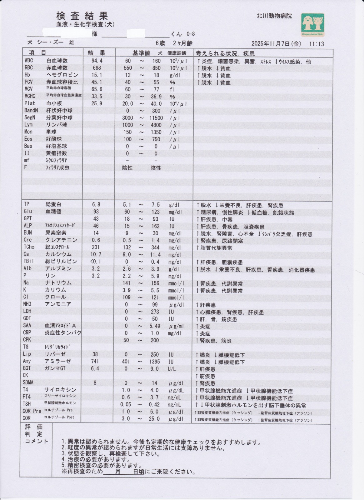 血液生化学検査はわんちゃんでは18項目 猫ちゃんでは16項目の腎臓や肝臓、膵臓などの数値を見る検査になります。